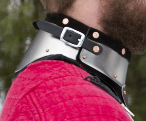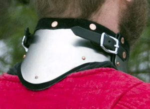 These gorgets are made of 18 gauge 304 stainless steel with 4-5oz suede leather lining, solid shank hammer-peined copper rivets and high quality latigo straps. Special attention is paid to properly rounding the edges of the steel plates, gorgets shouldn't be sharp!