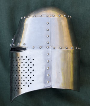 This Great Helm is modeled after the Pembridge Great Helm and features a central crease on the front of the helm that dissapates into the helm cap. For the modern practitioner the helm pictured shows plentiful breath holes on both the left and right sides of the helm. The bottom edge has also been given a generous roll for rigidity and comfort/safety.