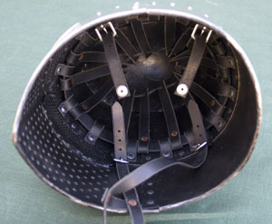 Lastly, this helm can be ordered with either an internal leather suspension with integrated two-piece chin-strap (pictured left) or with a series of very small holes around the circumference of the brow through which a textile liner can be sewn (chin-strap is separate). Lastly, the helm can also be ordered "bucket only" which omites both the leather suspension and stitching holes and will come only with the two-part chin-strap.