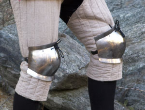 These early poleyns, also commonly referred to as "Soupcan Knees" are made from heat-treated .050" 1050 medium-carbon steel and are appropriate for early to mid 14th century kits as independant protection for the knee as well as part of a leg harness.