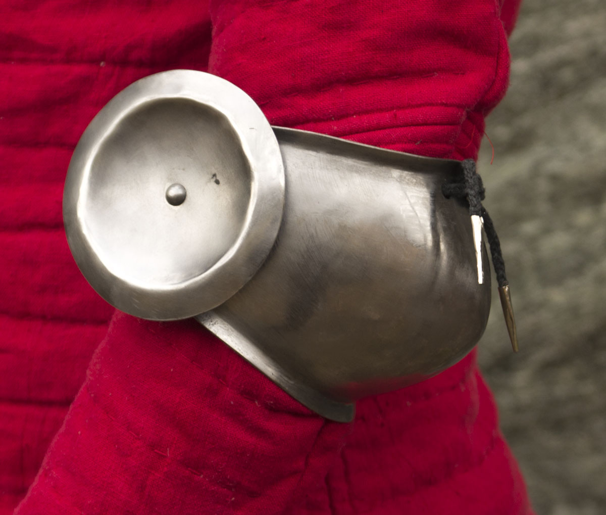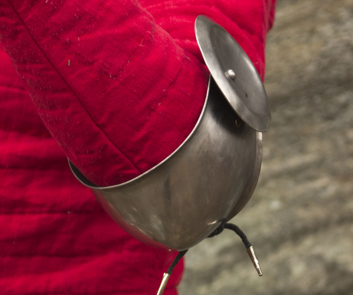 These rondel couters (elbow cops) are raised from a single piece of heat-treated .050" 1050 medium carbon steel. No welding is utilized in their construction. Due to the use of spring steel, they are exceptionally light, weighing in at a mere 10 ounces each.