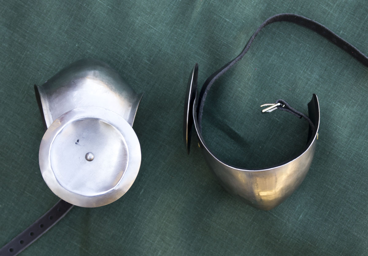 These couters are given a subtle point to capture the aesthetic of 14th century couters and also feature flared edges to both strengthen the cop, provide a deflecting edge for practice with metal weapons and to make them far more comfortable to wear and receive blows on.